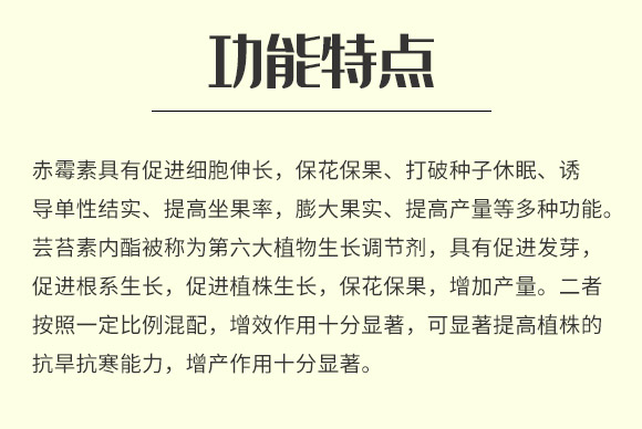 赤霉素具有促進細胞伸長,保花保果、打破種子休眠、誘導(dǎo)單性結(jié)實、提高坐果率,膨大果實、提高產(chǎn)量等多種功能。蕓苔素內(nèi)酯被稱為第六大植物生長調(diào)節(jié)劑,具有促進發(fā)芽,促進根系生長,促進植株生長,保花保果,增加產(chǎn)量。二者按照一定比例混配,增效作用十分顯著,可顯著提高植株的抗旱抗寒能力,增產(chǎn)作用十分顯著。