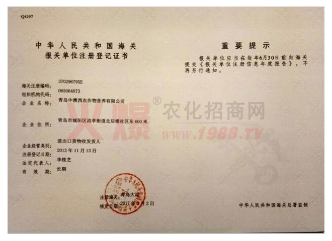 青島中澳西農(nóng)作物營養(yǎng)有限公司經(jīng)過多年的發(fā)展,于2015年正式成為多元化地進(jìn)口產(chǎn)品營運(yùn)商。不僅分銷國外先進(jìn)的植物營養(yǎng)產(chǎn)品,還分銷國外優(yōu)秀的農(nóng)副產(chǎn)品(如葡萄酒、咖啡...