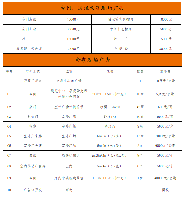 2.特裝展位費:700元/m2(原則上整體銷售),(6m×6m)25200元/個;(9m×6m)37800元/個;(9m×9m)56700元/個;(9m×12m)75600/個。